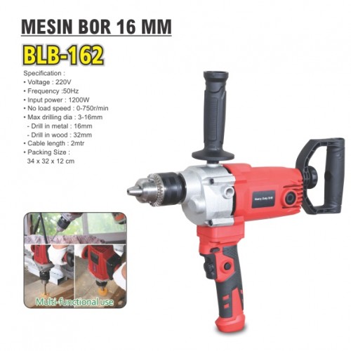 • Voltage : 220V • Frequency :50Hz • Input power : 1200W • No load speed : 0-750r/min • Max drilling dia : 3-16mm - Drill in metal : 16mm - Drill in wood : 32mm • Cable length : 2mtr