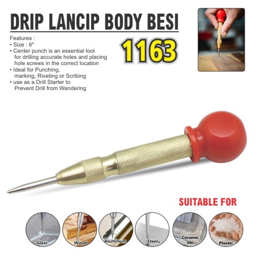 Pembuat Titik Tengah (Marking) sangat penting untuk memastikan lobang yang akan dibor tepat pada posisinya dan mata bor tidak lari kemana-mana menggores permukaan disekitarnya. Ukuran : 6 mm Features : • Size : 6" • Center punch is an essential tool for drilling accurate holes and placing hole screws in the correct location • Ideal for Punching, marking, Riveting or Scribing • use as a Drill Starter to Prevent Drill from Wandering