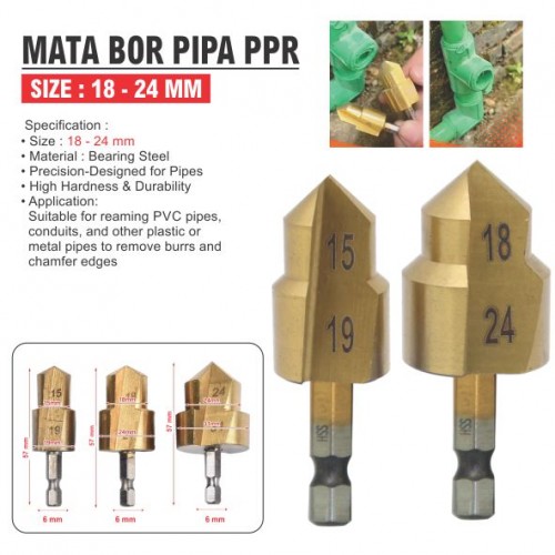 Specification : • Size : 18 -24 mm • Material : Bearing Steel • Precision-Designed for Pipes • High Hardness & Durability • Application: Suitable for reaming PVC pipes, conduits, and other plastic or metal pipes to remove burrs and chamfer edges