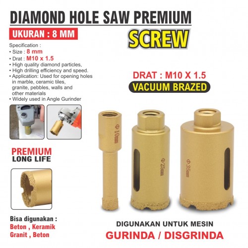 Specification : • Size : 8 mm • Drat : M10 x 1.5 • High quality diamond particles, • High drilling efficiency and speed. • Application: Used for opening holes in marble, ceramic tiles, granite, pebbles, walls and other materials • Widely used in Angle Gurinder