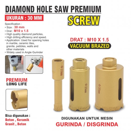 Specification : • Size : 30 mm • Drat : M10 x 1.5 • High quality diamond particles, • High drilling efficiency and speed. • Application: Used for opening holes in marble, ceramic tiles, granite, pebbles, walls and other materials • Widely used in Angle Gurinder