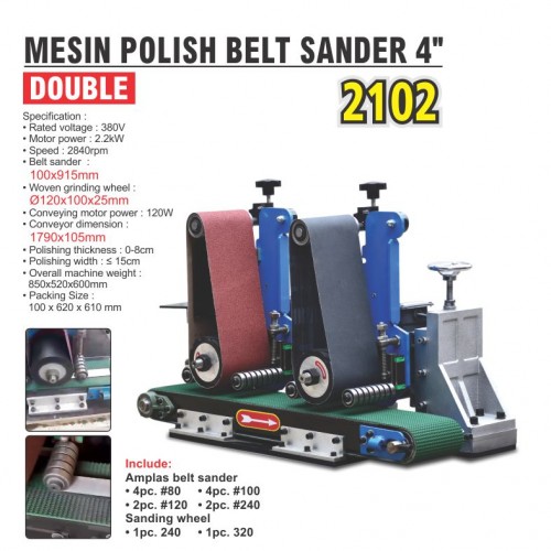 • Rated voltage : 380V • Motor power : 2.2kW • Speed : 2840rpm • Belt sander : 100x915mm • Woven grinding wheel : Ø120x100x25mm • Conveying motor power : 120W • Conveyor dimension : 1790x105mm • Polishing thickness : 0-8cm • Polishing width : ? 15cm • Overall machine weight : 850x520x600mm