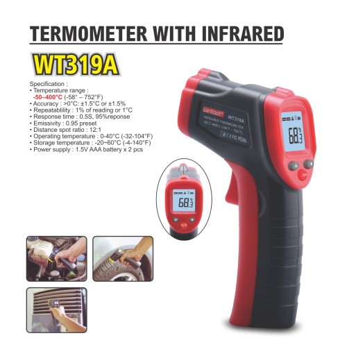 Specification : • Temperature range : -50–400°C (-58° – 752°F) • Accuracy : >0°C: ±1.5°C or ±1.5% • Repeatablility : 1% of reading or 1°C • Response time : 0.5S, 95%reponse • Emissivity : 0.95 preset • Distance spot ratio : 12:1 • Operating temperature : 0-40°C (-32-104°F) • Storage temperature : -20~60°C (-4-140°F) • Power supply : 1.5V AAA battery x 2 pcs