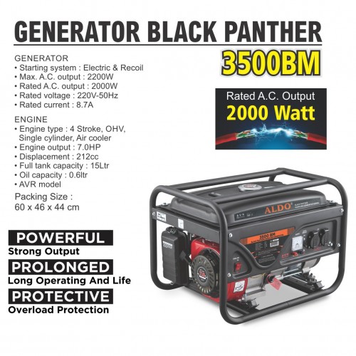 GENERATOR • Starting system : Electric & Recoil • Max. A.C. output : 2200W • Rated A.C. output : 2000W • Rated voltage : 220V-50Hz • Rated current : 8.7A ENGINE • Engine type : 4 Stroke, OHV, Single cylinder, Air cooler • Engine output : 7.0HP • Displacement : 212cc • Full tank capacity : 15Ltr • Oil capacity : 0.6ltr • AVR model • Gross weight : 38 Kg