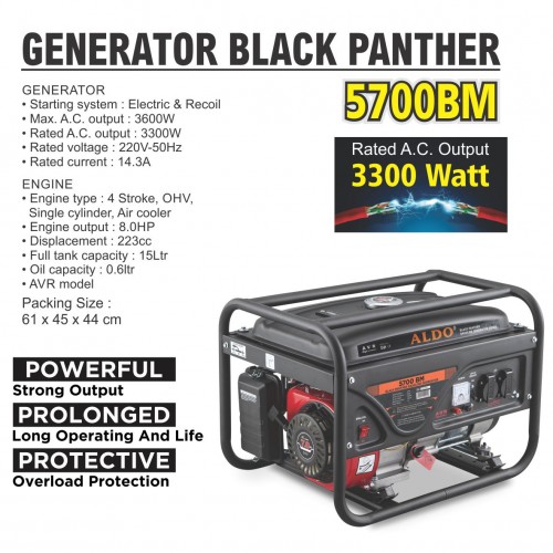 GENERATOR • Starting system : Electric & Recoil • Max. A.C. output : 3600W • Rated A.C. output : 3300W • Rated voltage : 220V-50Hz • Rated current : 14.3A ENGINE • Engine type : 4 Stroke, OHV, Single cylinder, Air cooler • Engine output : 8.0HP • Displacement : 223cc • Full tank capacity : 15Ltr • Oil capacity : 0.6ltr • AVR model • Gross weight : 46 Kg
