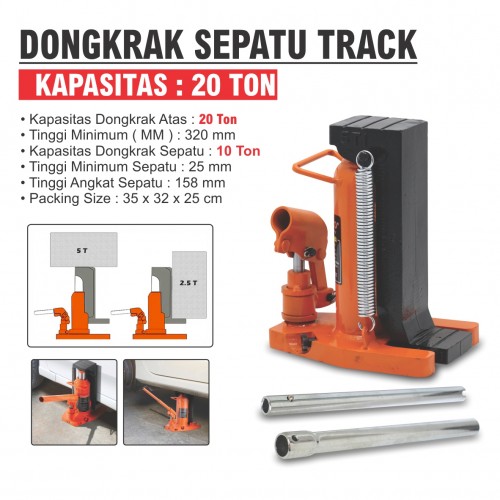 • Kapasitas Dongkrak Atas : 20 Ton • Tinggi Minimum ( MM ) : 320 mm • Kapasitas Dongkrak Sepatu : 10 Ton • Tinggi Minimum Sepatu : 25 mm • Tinggi Angkat Sepatu : 158 mm • Packing Size : 35 x 32 x 25 cm