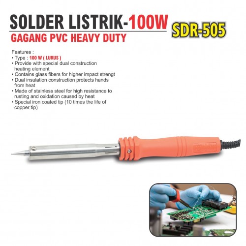 Features : • Power : 100 Watt • Provide with special dual construction heating element • Contains glass fibers for higher impact strengt • Dual insulation construction protects hands from heat • Made of stainless steel for high resistance to rusting and oxidation caused by heat • Special iron coated tip (10 times the life of copper tip)