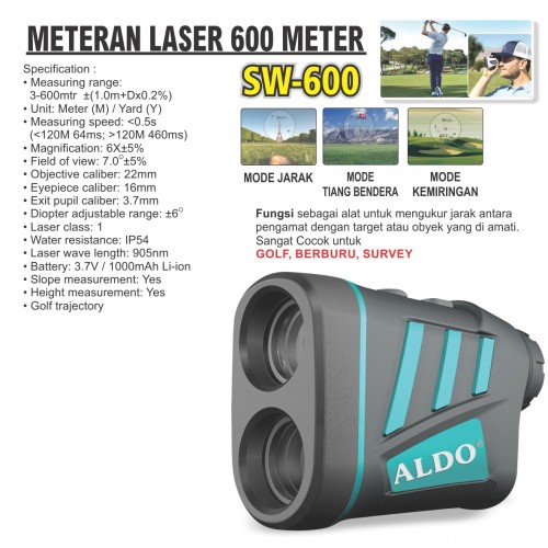 • Measuring range: 3-600mtr ±(1.0m+Dx0.2%) • Unit: Meter (M) / Yard (Y) • Measuring speed: ?0.5s (?120M 64ms; ?120M 460ms) • Magnification: 6X±5% O • Field of view: 7.0 ±5% • Objective caliber: 22mm • Eyepiece caliber: 16mm • Exit pupil caliber: 3.7mm O • Diopter adjustable range: ±6 • Laser class: 1 • Water resistance: IP54 • Laser wave length: 905nm • Battery: 3.7V / 1000mAh Li-ion • Slope measurement: Yes • Height measurement: Yes • Golf trajectory