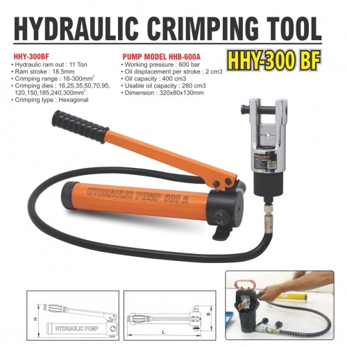 HHY-300BF • Hydraulic ram out : 11 Ton • Ram stroke : 18.5mm • Crimping range : 16-300mm2 • Crimping dies : 16,25,35,50,70,95, 120,150,185,240,300mm2 • Crimping type : Hexagonal • Weight : 12 kg Pump model HHB-600A • Working pressure : 600 bar • Oil displacement per stroke : 2 cm3 • Oil capacity : 400 cm3 • Usable oil capacity : 280 cm3 • Dimension : 320x80x130mm
