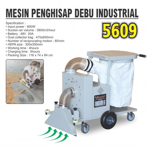 • Input power : 800W • Suction air volume : 3800m3/hour • Battery : 48V 20A • Dust collector bag : 470x650mm • Number of reciprocating motion : 85/min • HEPA size : 300x300mm • Working time : 4hours • Charging time : 5hours