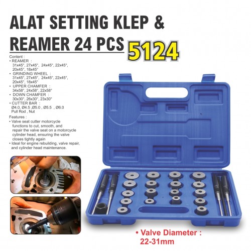 Content • REAMER: 31x45*, 27x45. 24x45*, 22x45*. 20x45*, 18x45° • GRINDING WHEEL 31x45', 27x45", 24x45*, 22x45*. 20x45*, 18x45° • UPPER CHAMFER 34x58*, 24x58", 22x58° • DOWN CHAMFER 30x30*, 26x30", 23x30* • CUTTER BAR 04.0.04.5.050.05.5.060 Pull Rod, Nut Features : • Valve seat cutler motorcycle functions to cut, smooth, and repair the valve seat on a motorcycle cylinder head, ensuring the valve closes lightly again • Ideal for engine rebuilding, valve repair, and cylinder head maintenance.