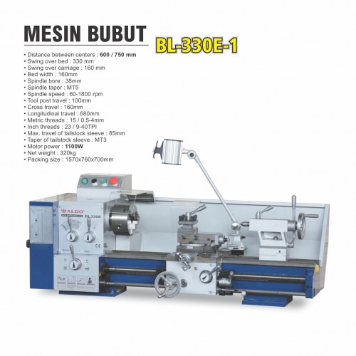 Distance between centers : 600/750mm Swing over head : 330mm Swing over carriage : 160mm Bed width : 160mm Spindle bore : 38mm Spindle taper : MT5 Spindle speed : 60-1800rpm Tool post travel : 100mm Cross travel : 160mm Longitudinal travel : 680mm Metric threads : 15 / 0.5 - 4mm Inch threads : 23 / 9 - 40TPI Max travel of tailstock sleeve : 85mm Taper of tailsock sleeve : MT3 Motor power : 1100W