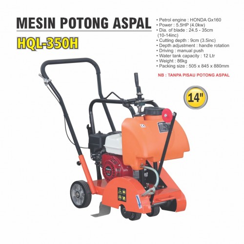 Petrol engine : HONDA GX160 Power : 5.5 HP (4.0 kw) Dia. of blade : 24.5 - 35 cm (10 - 14 inc) Cutting depth : 9 cm (3.5 inc) Depth adjustment : handle rotation Driving : manual push Water tank capacity : 12 Ltr Weight : 85 kg Packing size : 505 x 845 x 880 mm NB : TANPA PISAU POTONG ASPAL