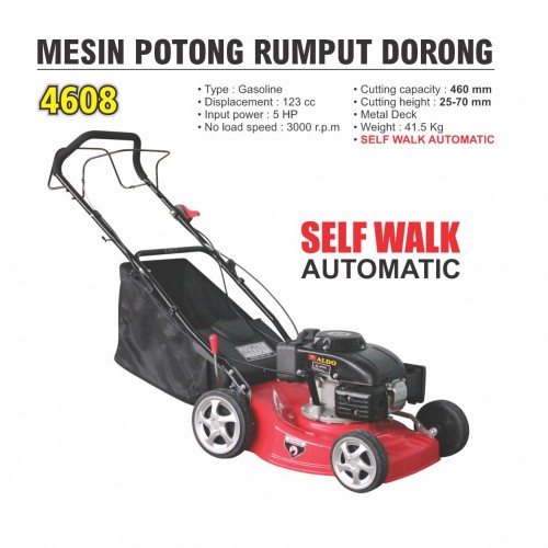 Type : Gasoline Displacement : 123 cc Input power : 5 HP No load speed : 3000 r.p.m Cutting capacity : 460 mm Cutting height : 25 - 70 mm Metal Deck SELF WALK AUTOMATIC