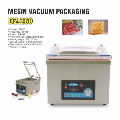 Model : DZ-260 Voltage : 220 V Frequency : 50 Hz Power : 1.0 kW Workroom size : 280x390x60 mm Sealing length : 260x10 mm Sealing speed : 1-4 times/minute External size : 485x340x345 mm Weight : 33 kg