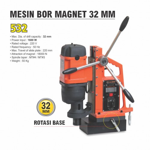 Type : BMN 532 Max diameter of drill capacity : 32 mm Power input : 1300W Rated voltage : 220V Rated frequency : 50Hz Max travel of slide plate : 180 mm Attraction of magnet : 14000 N Weight : 32 kg
