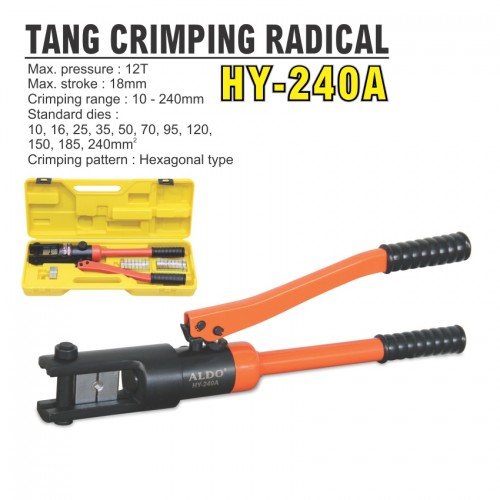 Max. pressure : 12T Max. stroke : 18 mm Crimping range : 10 - 240 mm Standard dies : 10, 16, 25, 35, 50, 70, 95, 120, 150, 185, 240 mm2 Crimping pattern : Hexagonal type Gross weight : 6.2 kg