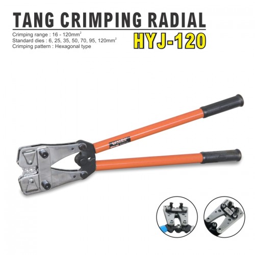 Crimping range : 16 - 120 mm2 Standard dies : 6, 25, 35, 50, 70, 95, 120 mm2 Crimping pattern : Hexagonal type
