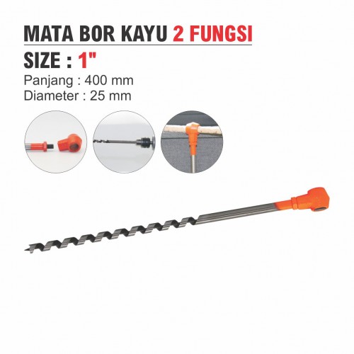 Mata bor kayu auger bit digunakan untuk pengeboran pada aneka jenis kayu atau material lunak lainnya. Biasa digunakan dengan putaran mesin / rpm rendah. Panjang : 400 mm Dia : 25