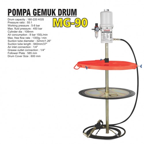 • Drum capacity : 180-220 KGS • Pressure ratio : 55:1 • Working pressure : 5-8 bar • Max. fluid pressure : 450 bar • Cylinder dia : 108mm • Air concumption : 8 bar 150L/min • Max. free flow rate : 1300g / min • Suction tube diameter : 32mm/1.26" • Suction tube length : 940mm/37" • Air inlet connection : 1/4" • Grease outlet connection : 1/4"