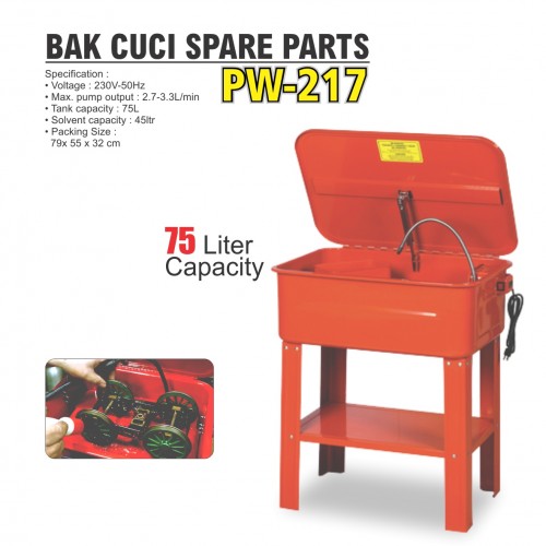 • Voltage : 230V-50Hz • Max. pump output : 2.7-3.3L/min • Tank capacity : 75L • Solvent capacity : 45ltr