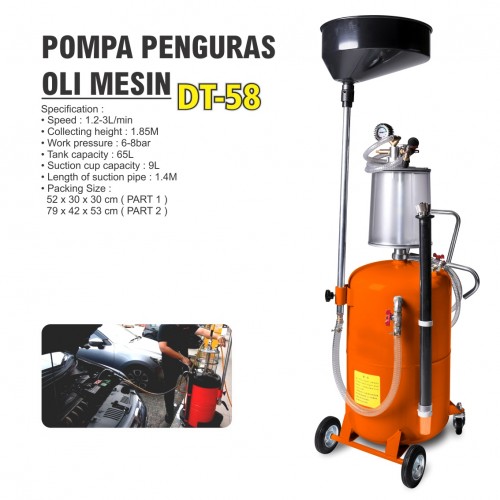 • Speed : 1.2-3L/min • Collecting height : 1.85M • Work pressure : 6-8bar • Tank capacity : 65L • Suction cup capacity : 9L • Length of suction pipe : 1.4M