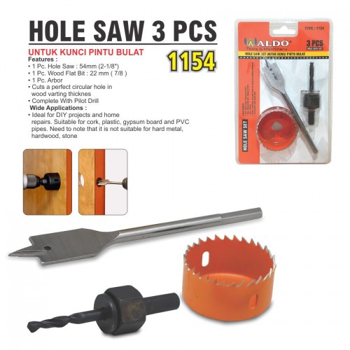 Features : • 1 Pc. Hole Saw : 54mm (2-1/8") • 1 Pc. Wood Flat Bit : 22 mm ( 7/8 ) • 1 Pc. Arbor • Cuts a perfect circular hole in wood varting thicknes • Complete With Pilot Drill Wide Applications : • Ideal for DIY projects and home repairs. Suitable for cork, plastic, gypsum board and PVC pipes. Need to note that it is not suitable for hard metal, hardwood, stone
