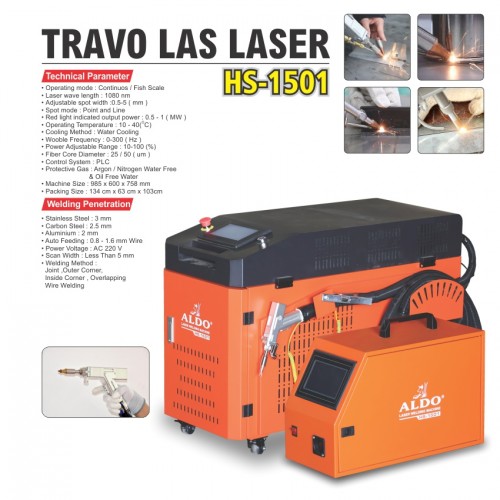 Technical Parameter • Operating mode : Continuos / Fish Scale • Laser wave length : 1080 nm • Adjustable spot width :0.5-5 ( mm ) • Spot mode : Point and Line • Red light indicated output power : 0.5 - 1 ( MW ) • Operating Temperature : 10 - 40(OC) • Cooling Method : Water Cooling • Wooble Frequency : 0-300 ( Hz ) • Power Adjustable Range : 10-100 (%) • Fiber Core Diameter : 25 / 50 ( um ) • Control System : PLC • Protective Gas : Argon / Nitrogen Water Free & Oil Free Water • Machine Size : 985 x 600 x 758 mm • Packing Size : 134 cm x 63 cm x 103cm Welding Penetration • Stainless Steel : 3 mm • Carbon Steel : 2.5 mm • Aluminium : 2 mm • Auto Feeding : 0.8 - 1.6 mm Wire • Power Voltage : AC 220 V • Scan Width : Less Than 5 mm • Welding Method : Joint ,Outer Corner, Inside Corner , Overlapping Wire Welding