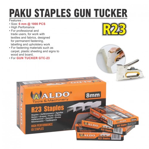 Features : • Size: 8 mm @ 1000 PCS • High Perfomance • For professional and trade users, for work with textiles and fabrics, designed for permanent fastening, labelling and upholstery work • For fastening materials such as carpet, plastic sheeting and signs to wood and board, • For GUN TUCKER GTC-23