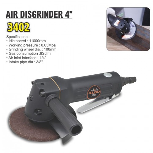 Specification : • Idle speed : 11000rpm • Working pressure : 0.63Mpa • Grinding wheel dia. : 100mm • Gas consumption :6Scfm • Air inlet interface : 1/4” • Intake pipe dia : 3/8"