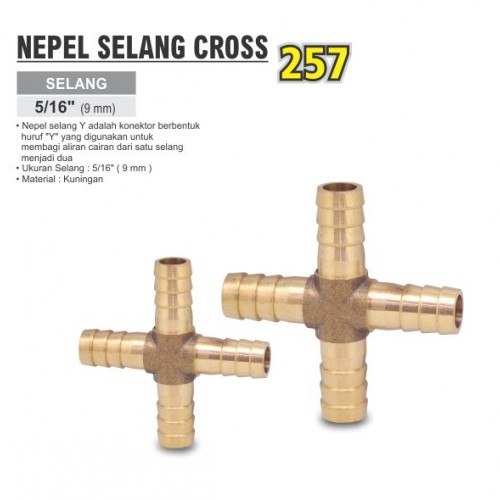 Nepel selang cross adalah konektor berbentuk salib (X) yang digunakan untuk menghubungkan empat selang atau pipa Bahan : Kuningan Diameter selang : 8 mm