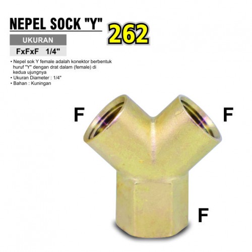 Nepel sok Y female adalah konektor berbentuk huruf "Y" dengan drat dalam (female) di kedua ujungnya. Ini memungkinkan penyambungan dua selang atau pipa dengan drat luar. Ukuran Diameter : 1/4" Bahan : Kuningan