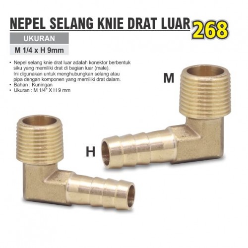 Nepel selang knie drat luar adalah konektor berbentuk siku yang memiliki drat di bagian luar (male). Ini digunakan untuk menghubungkan selang atau pipa dengan komponen yang memiliki drat dalam. Bahan : Kuningan Ukuran : M 1/4" X H 9 mm