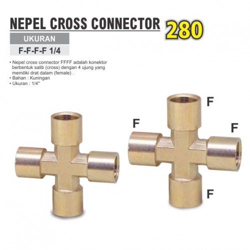 Nepel cross connector FFFF adalah konektor berbentuk salib (cross) dengan 4 ujung yang memiliki drat dalam (female) . Bahan : Kuningan Ukuran : 1/4"