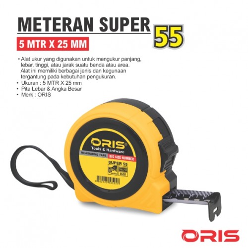 • alat ukur yang digunakan untuk mengukur panjang, lebar, tinggi, atau jarak suatu benda atau area. Alat ini memiliki berbagai jenis dan kegunaan tergantung pada kebutuhan pengukuran. • Ukuran : 5 MTR X 25 mm • Pita Lebar & Angka Besar • Merk : ORIS