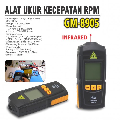 • LCD display: 5-digit large screen • Unit : RPM • Range : 2.5-99999 rpm • Resolution ratio : - 0.1 rpm (2.5-999.9rpm) - 1 rpm (1000-99999rpm) • Basic precision : - (0.1%n+5d)rpm ; (2.5-999.9rpm) - (1%n+5d)rpm ; (1000-99999rpm) • Laser power : class IIIA 2 - 5mW • Measuring distance : 50-500mm • Power supply : Battery 1.5V, AA ( 2pcs ) • Dimension : 55.7x29.9x127mm • Weight : 106grm