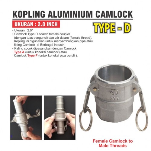 • Ukuran : 2.0" • Camlock Type D adalah female coupler (dengan tuas pengunci) dan ulir dalam (female thread). Kopling ini digunakan untuk menyambungkan pipa atau fitting Camlock di Berbagai Industri. • Paling cocok dipasangkan dengan Camlock Type A (untuk koneksi camlock) atau Camlock Type F (untuk koneksi pipa berulir).